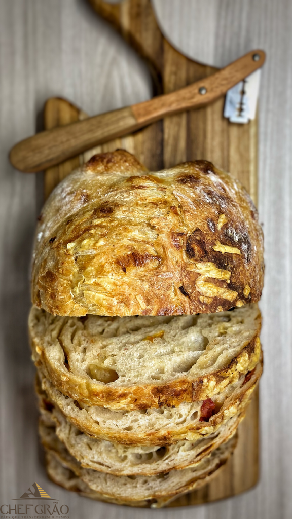 Uma versão sofisticada de um clássico, combinando o sabor do parmesão de qualidade com tomates assados lentamente. O Chef Alex traz este pão irresistível, feito com fermentação natural, onde o sabor do parmesão se mistura ao doce e profundo sabor dos tomates assados. Cada pedaço é uma explosão de sabor, com a crocância da crosta e a suavidade do miolo. Perfeito para ser apreciado sozinho ou como acompanhamento de pratos mais elaborados. Ideal para sanduíches ou simplesmente aquecido com um fio de azeite ou manteigas temperadas.